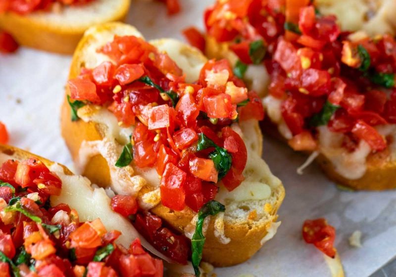 Fresh tomato, basil, garlic, onion, olive oil on toasted bread.