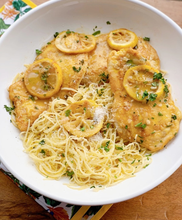 Lightly floured egg-dipped chicken cutlet sautéed in a white wine lemon butter sauce.