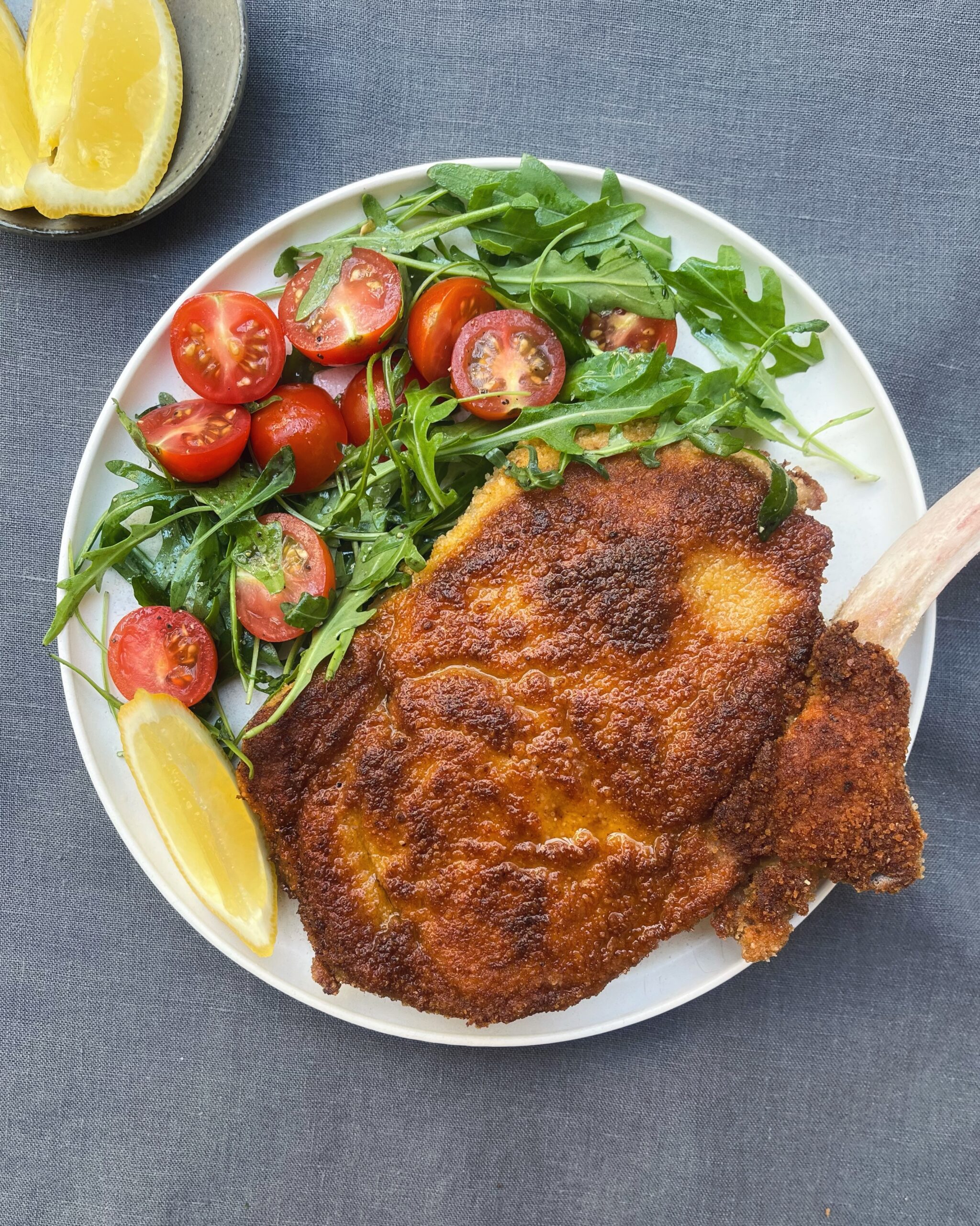 Thin breaded scallopini veal topped with arugula and chopped tomatoes.